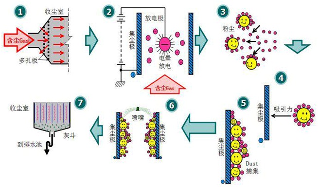 金屬放電線在直流高電壓的作用下①,將其周圍氣體電離②,使粉塵或霧滴粒子表面荷電③,荷電粒子在電場力的作用下向收塵極運動④,并沉積在收塵極上⑤,水流從集塵板頂端流下,在集塵板上形成一層均勻穩定的水膜⑥,將板上的顆粒帶走⑦。因此,濕式電除塵器與干式ESP的除塵原理基本相同,都要經歷荷電、收集和清灰三個階段,區別在于清灰方式的不同,濕式電除塵器采用液體沖刷集塵極表面來進行清灰。其工作原理如圖1。