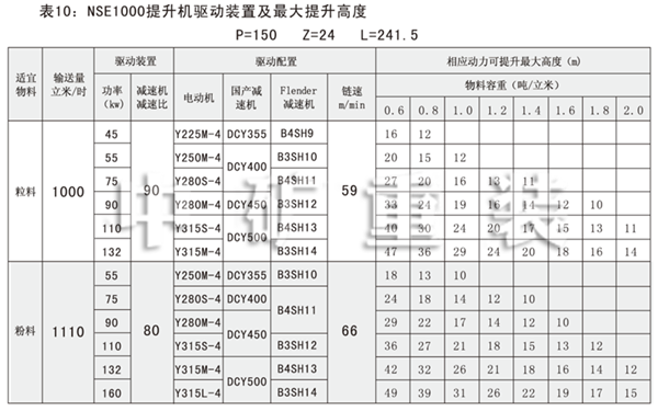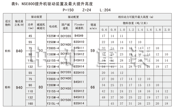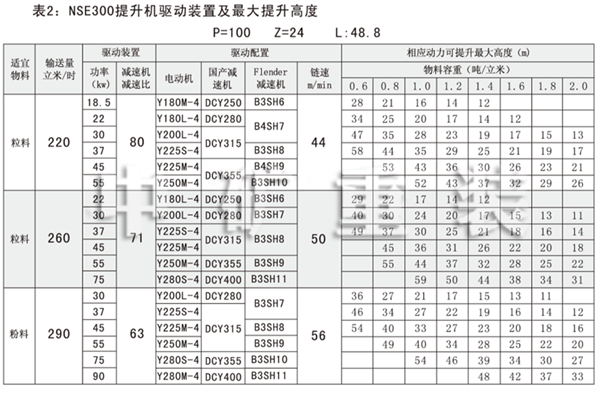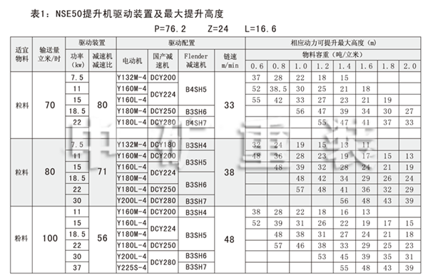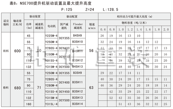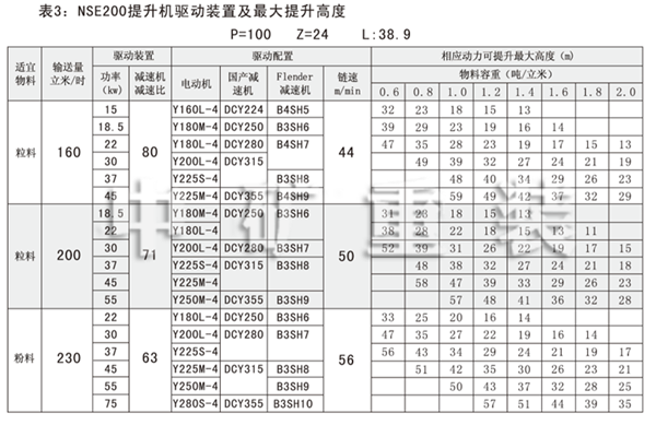 NSE系列高速板鏈斗式提升機(jī)共有九種基本型號:NSE100、NSE200、NSE300、NSE400、NSE500、NSE600、NSE700、NSE800、NSE1000,每種型號根據(jù)輸送物料的不同,選擇不同的提升速度,提升速度≤70m/min,提升高度65m。另外,中礦公司還可根據(jù)用戶要求輸送量介于上述型號之間的擴(kuò)展型號。